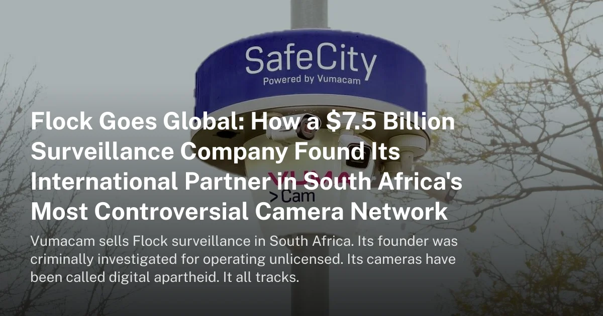 Vumacam sells Flock surveillance in South Africa. Its founder was criminally investigated for operating unlicensed. Its cameras have been called digital apartheid. It all tracks.