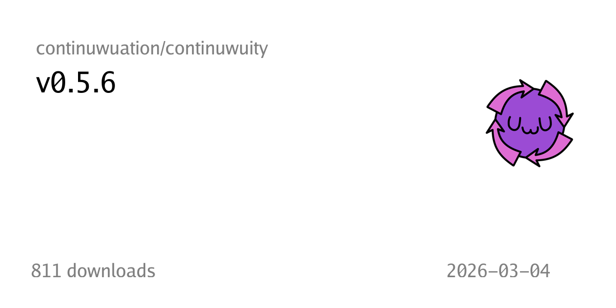 # Continuwuity 0.5.6 *Continuwuity is a community-driven Matrix chat server, designed to be efficient and easy to run* > no, federation drug will kill the patient! she needs soft fails to live! Aaaand we're back, just l…